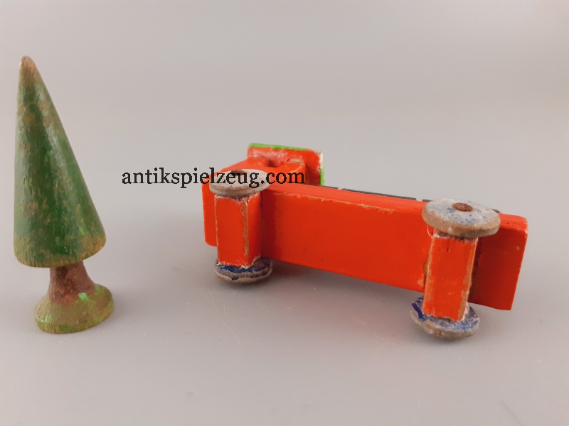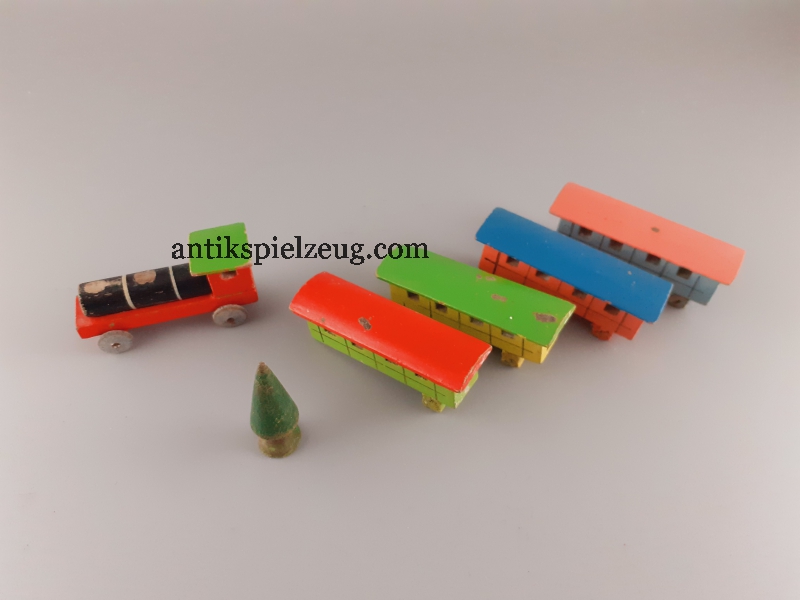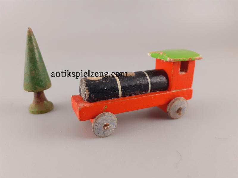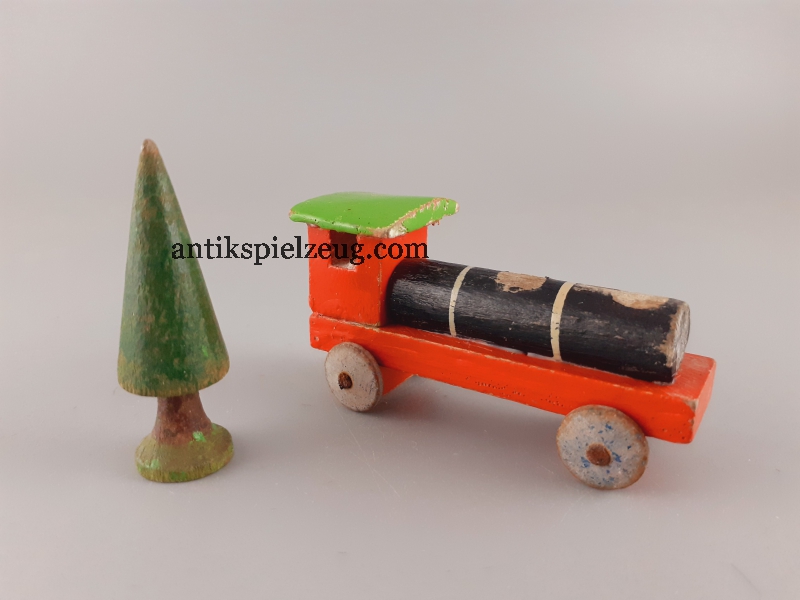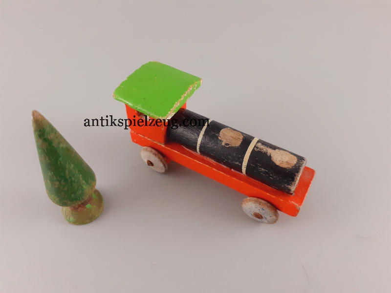 - Konvolut Holzspielzeug Zug/Dampflok (ohne Kamine), 4 Wagons (2 Wagons haben nur eine Achse, alle ohne Räder), 1 Baum