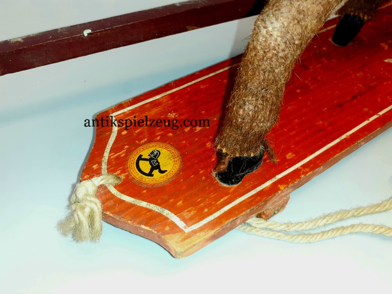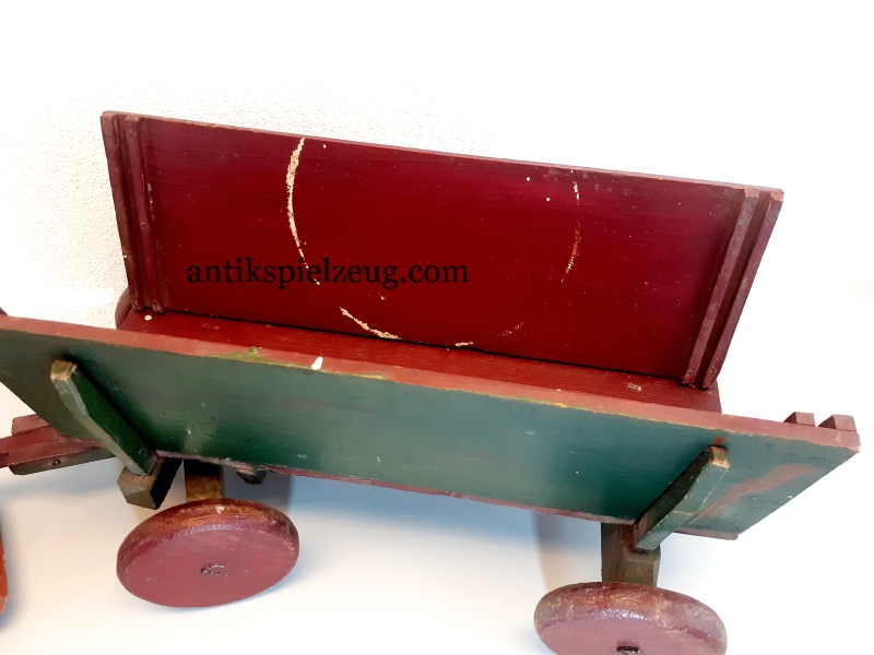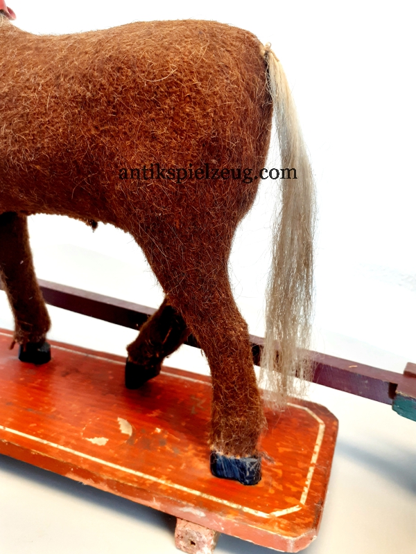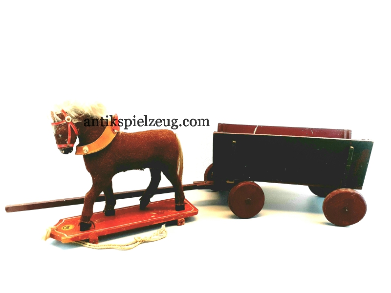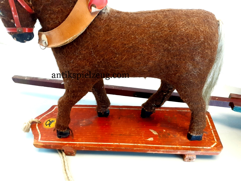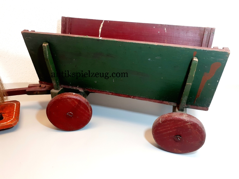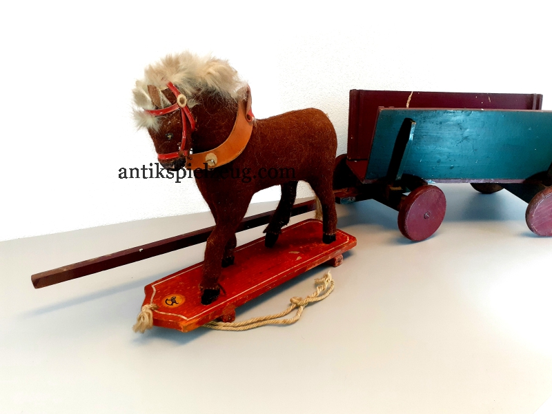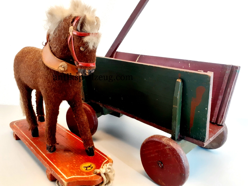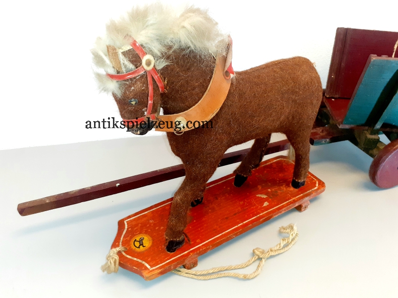 Es steht auf einer Holzplatte mit Markenzeichen. Die Farben sind kräftig. Ein Wagen aus Holz macht das Gespann zu dem was es ist. Eine Rarität !