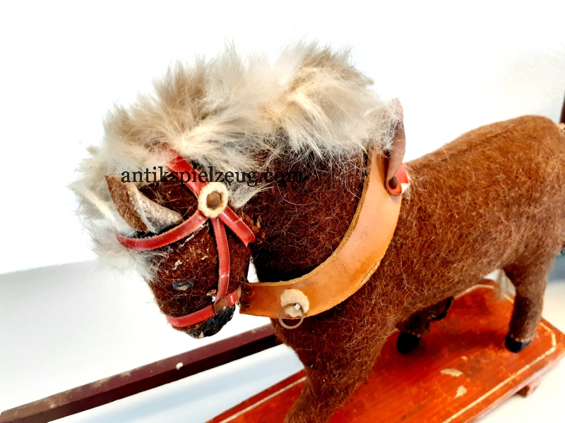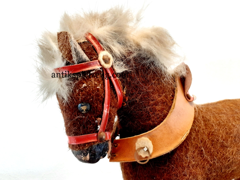 Der Grundkörper des einzigartigen Pferdes wurde aus Holz geschnitzt, wobei wir keinerlei Brüche ertasten können. Sodann wurde der Körper mit Stoff/dünnen Leinen umspannt und befestigt. Die Augen sind aus Metallknöpfen gefertigt. Hasenfell ziert eine kräftige Mähne und der Schweif besteht aus echtem Haar. Die Ohren sind aus echtem Leder gefertigt, genauso wie das Zaumzeug.